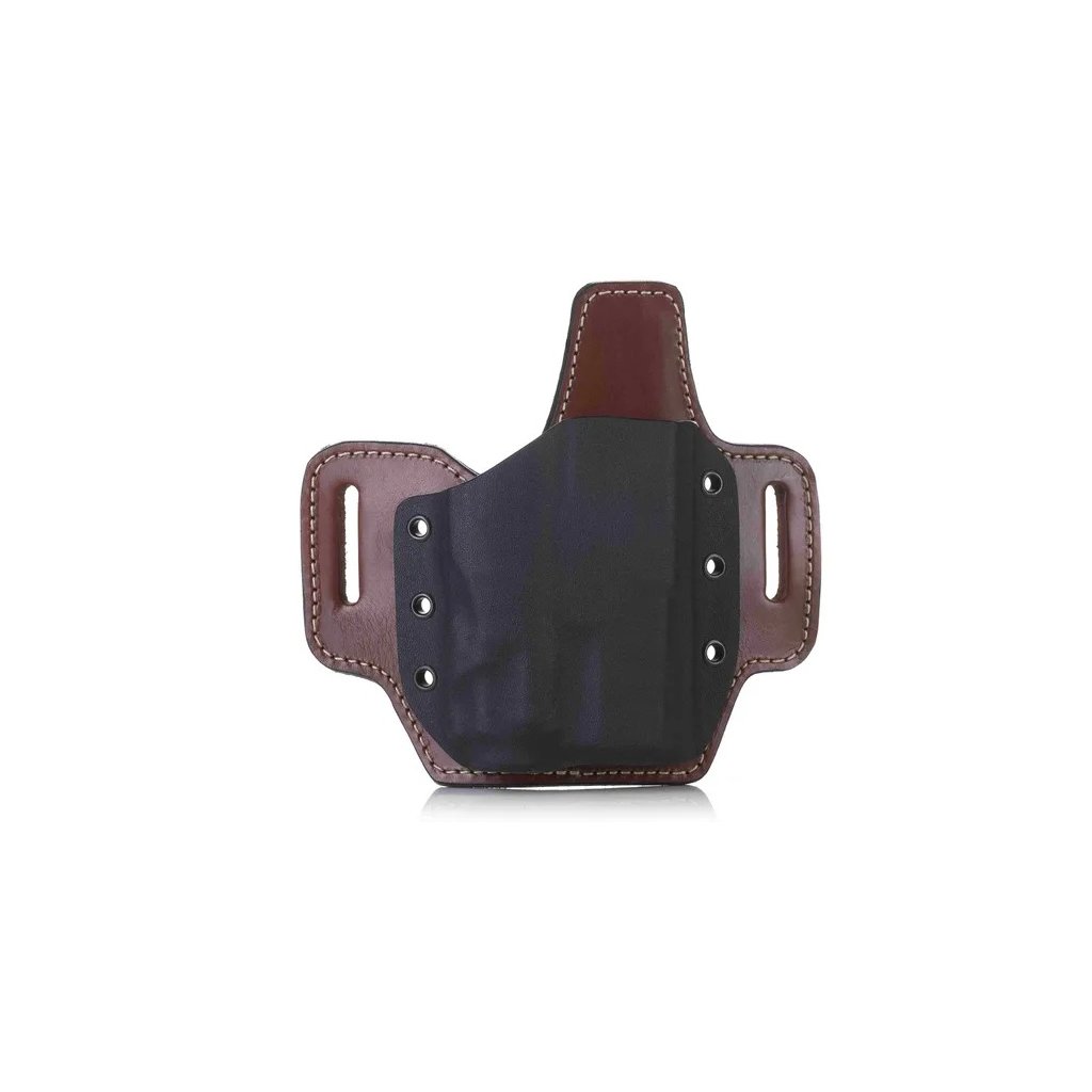 Ručně vyrobeno z pravé italské kůže a pravého amerického Kydexu, aby dokonale padlo na vaši zbraň . Kožená platforma se dvěma otvory na opasek po stranách rovnoměrně rozkládá hmotnost střelné zbraně a poskytuje dokonalou stabilitu na opasku.