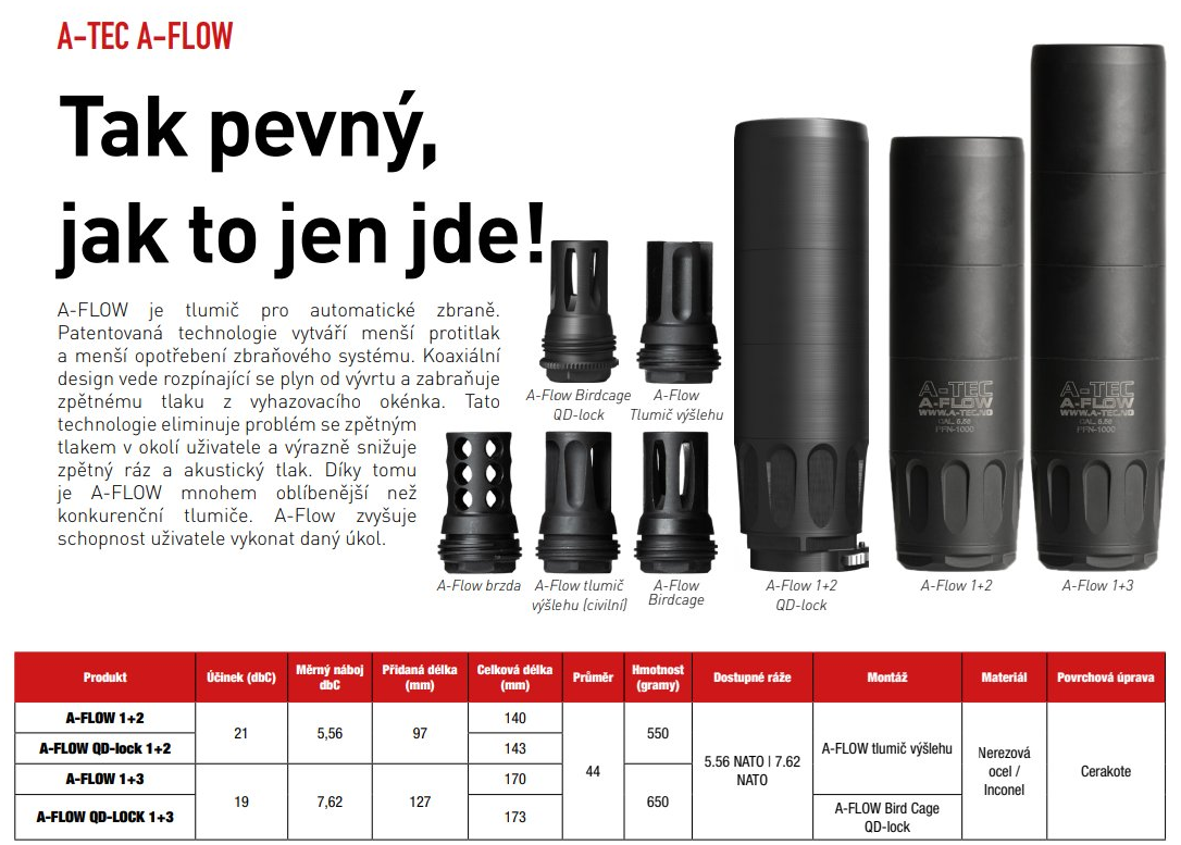 Robustní tlumič výšlehu s novým uzamykacím systémem QD Lock slouží zároveň jako montážní rozhraní pro rychlé nasazení tlumiče A-FLOW. Patentovaná koaxiální technologie tlumičů A-FLOW vede rozpínající se plyn od vývrtu, čímž výrazně snižuje protitlak, opotřebení zbraňového systému a omezuje únik plynů z vyhazovacího okénka. Výsledkem je nižší zpětný ráz, nižší akustický tlak v okolí uživatele a vyšší efektivita plnění úkolu – i při použití na automatických zbraních.