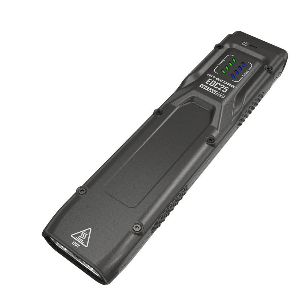 EDC25 je nástupkyně svítilny EDC27, která byla představena na Shot Show 2023 jako horká novinka EDC svítilny od Nitecore. Svítilna má koncepci nezvykle plochého tvaru, vhodného pro každodení nošení. Hlavní změnou oproti předchozímu modelu je vyšší intenzita světelného kuželu (kandela) díky použitým LED vyrobeným společností Nitecore. S tím souvisí i delší dosvit a celkově prodloužení doby svitu u jednotlivých režimů. Dále oproti předchozímu modelu se na svítilně nenachází displej ale dvě řady LED. EDC25 je nabíjecí svítilna s vysokým světelným výkonem 3000 lm (22 500cd) s dosvitem 300 metrů při použití 2 x NiteLab UHi20 LEDs. V reflektoru svítilny je umístěný senzor snímání vzdálenosti od pevné překážky. To slouží jako ochrana před nechtěném popálení od vysoce výkonné svítilny. K ovládání svítilny slouží dvě velká tlačítka nacházející se na konci svítilny. Jedno vystouplé ON/OFF a druhé nízké (dvoustupňové) tlačítko MODE. První tlačítko slouží k zapínání / vypínání jak stálého tak momentového světla. Druhé tlačítko MODE slouží k přepínání 5 světelných režimů a stroboskop. Tlačítko je dvoustupňové. Namáčknutím aktivujeme režim Turbo (3000 lm) a domáčnutím tlačítka aktivujeme režim proměnlivého stroboskopu 2 generace. Tlačítka svítilny lze i bezpečně uzamknout 2 druhy zámku. V prvním případě lze uzamknout tlačítko ON/OFF a funkční je jen tlačítko mode pro funkci TURBO-READY a režim STROBO-READY. V případě druhé možnosti zámku uzamknete funkci obou tlačítek svítilny tak, aby v žádném případě nedošlo k jejímu nechtěnému zapnutí např. při přepravě v zavazadlovém prostoru. Li-Ion akumulátoru o kapacitě 1700mAh je napájen přes integrovaný micro USB-C konektor. Na těle svítilny se nachází dvě řady diod, které zobrazují jak zvolený režim svícení tak i aktuální stav nabitosti akumulátoru. NITECORE EDC25 má tělo vyrobené z nerezové oceli s titanovou povrchovou úpravou. Při své ploché konstrukci a hmotnosti pouze 104 g je to ideální kapesní svítilna od Nitecore pro každodení nošení od společnosti NITECORE.