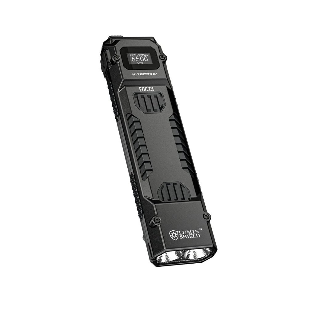 EDC29 svítilna má koncepci nezvykle plochého tvaru vhodného pro každodení nošení. Nově využívá jako zdroj světla 2x LED UHi 20 MAX. Díky novým led se prodloužil dosvit až na 400 metrů s vysokým výkonem světelného toku 6 500 lm a intenzitou světelného kuželu (40 230cd). K ovládání svítilny slouží dvě velká tlačítka nacházející se na konci svítilny. Jedno vystouplé ON/OFF a druhé nízké (dvoustupňové) tlačítko MODE. První tlačítko slouží k zapínání / vypínání jak stálého tak momentového světla. Druhé tlačítko MODE slouží k přepínání 5 světelných režimů a stroboskopu. Tlačítko je dvoustupňové. Namáčknutím aktivujeme režim Turbo (6 500 lm) a domáčnutím tlačítka aktivujeme režim proměnlivého stroboskopu 2 generace. Tlačítka svítilny lze i bezpečně uzamknout 2 druhy zámku. V prvním případě lze uzamknout tlačítko ON/OFF a funkční je jen tlačítko mode pro funkci TURBO-READY a funkci STROBO-READY. V případě druhé možnosti zámku uzamknete funkci obou tlačítek svítilny tak, aby v žádném případě nedošlo k jejímu nechtěnému zapnutí např. při přepravě v zavazadlovém prostoru. K tomu slouží posuvné tlačítko na boku svítilny. Další ochranou před nechtěným sepnutí TURBO výkonu např. v zavazadlovém prostoru je je senzor vzdálenosti, umístěný v hlavě reflektoru. Li-Ion akumulátoru o kapacitě 2 500 mAh je napájen přes integrovaný micro USB-C konektor. Na těle svítilny se nachází OLED display, který zobrazuje jak zvolený režim svícení tak i dobu svitu na daný režim. NITECORE EDC29 má tělo vyrobené z nerezové oceli s titanovou povrchovou úpravou. Při své ploché konstrukci a hmotnosti pouze 160 g je to ideální kapesní svítilna od Nitecore pro každodení nošení.