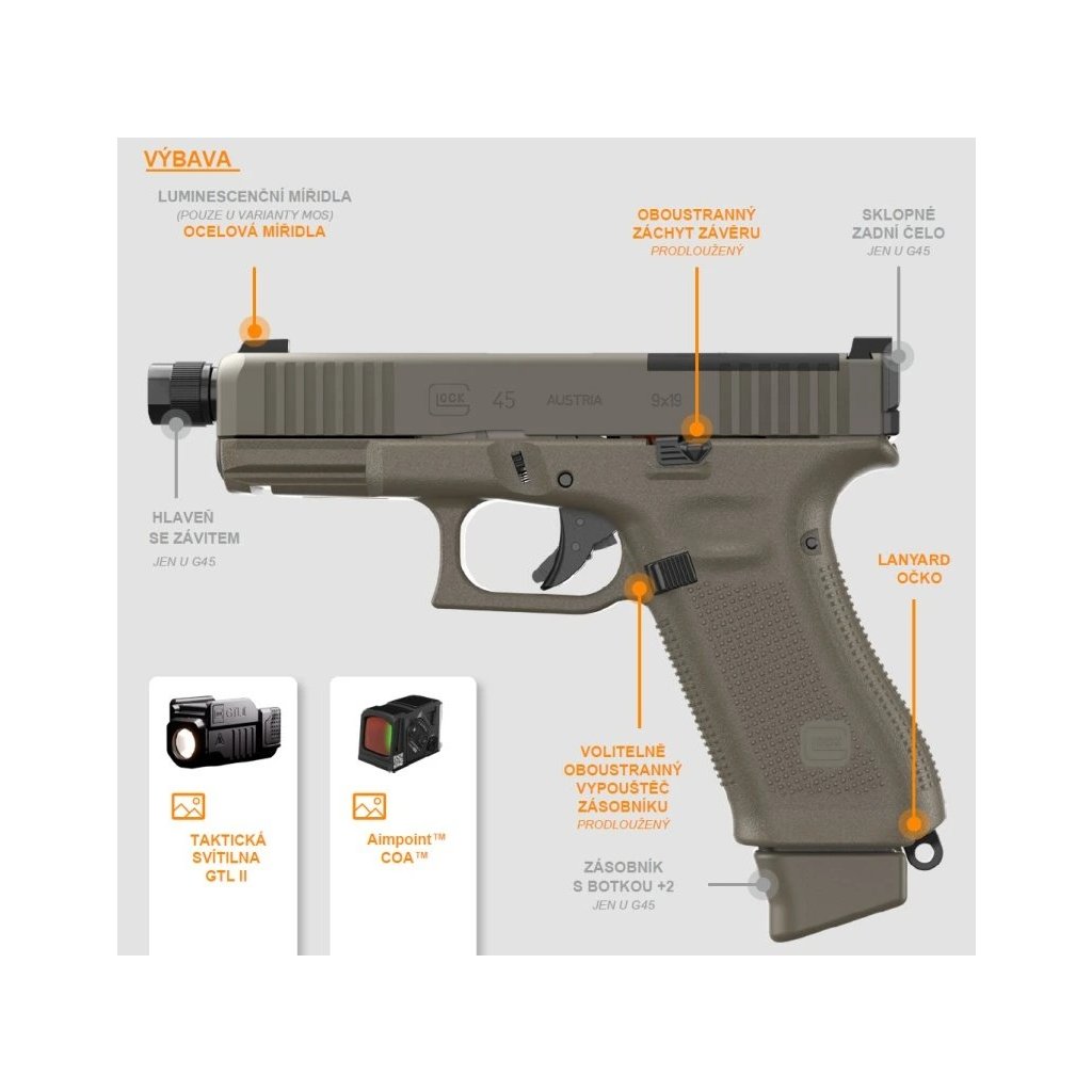 Glock 45 A-CUT COA je model velikosti CROSSOVER v ráži 9 mm Luger dodávaný jako COMBO s kolimátorem Aimpoint COA