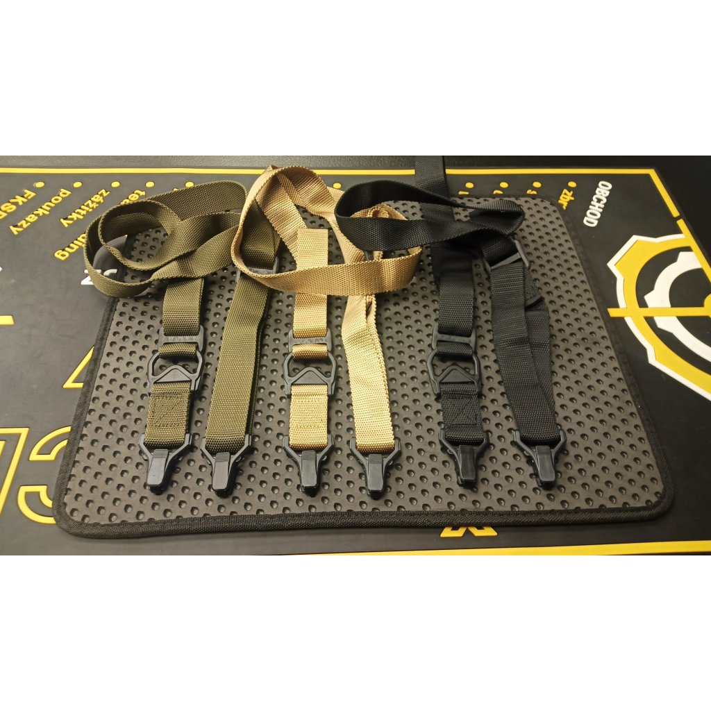 Taktický - jednoduchý popruh s kovovou sponou ke zbrani, určený k jednobodovému i dvoubodovému závěsu.