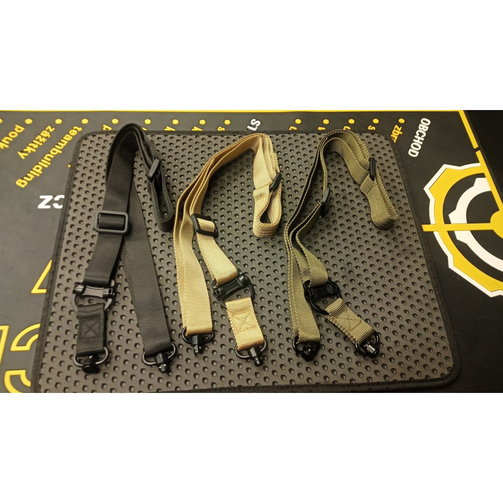 Taktický zbraňový popruh s kovovou sponou QD a dvěma QD koncovkami, určený k jednobodovému i dvoubodovému závěsu.