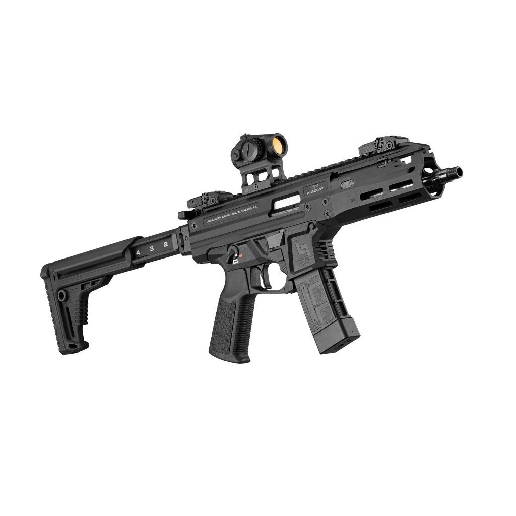 Patentovaná technologie bržděného závěru Delayed Matter Technology s wolframovým protizávažím výrazně snižuje zpětný ráz. Upper z eloxované slitiny hliníku doplňuje spodní polymerový rám s pistolovou rukojetí odpovídající standardu AR15. Na Picatinny lištu v zadní části je možné uchytit jakoukoliv komerčně dostupnou pažbu. V sadě je sklopná teleskopická pažba vlastní konstrukce od Lucansky Arms.