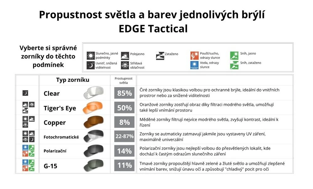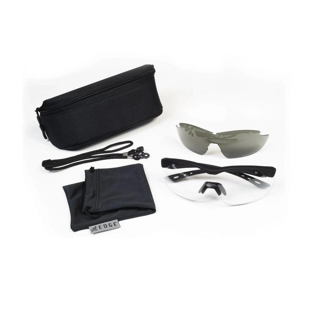 Střelecké brýle od amerického výrobce EDGE EYEWEAR. Všechny čočky jsou vyrobeny z odolného polykarbonátu a poskytují 99,9% ochranu proti UV záření A/B/C, přičemž jejich největší předností je unikátní technologie VAPOR SHIELD, která zaručuje, že se brýle nezamlží ani v těch nejdrsnějších podmínkách. Jak je možné vidět v přiloženém videu z testování, brýle se nezamlžily ani po více než 260 sekundách testování párou. Čočky jsou 2,2 mm tlusté a jsou opatřeny trojitou ochrannou vrstvou proti poškrábání. Obroučky jsou vyrobeny z velmi ohebného a odolného materiálu TR90/nylon.