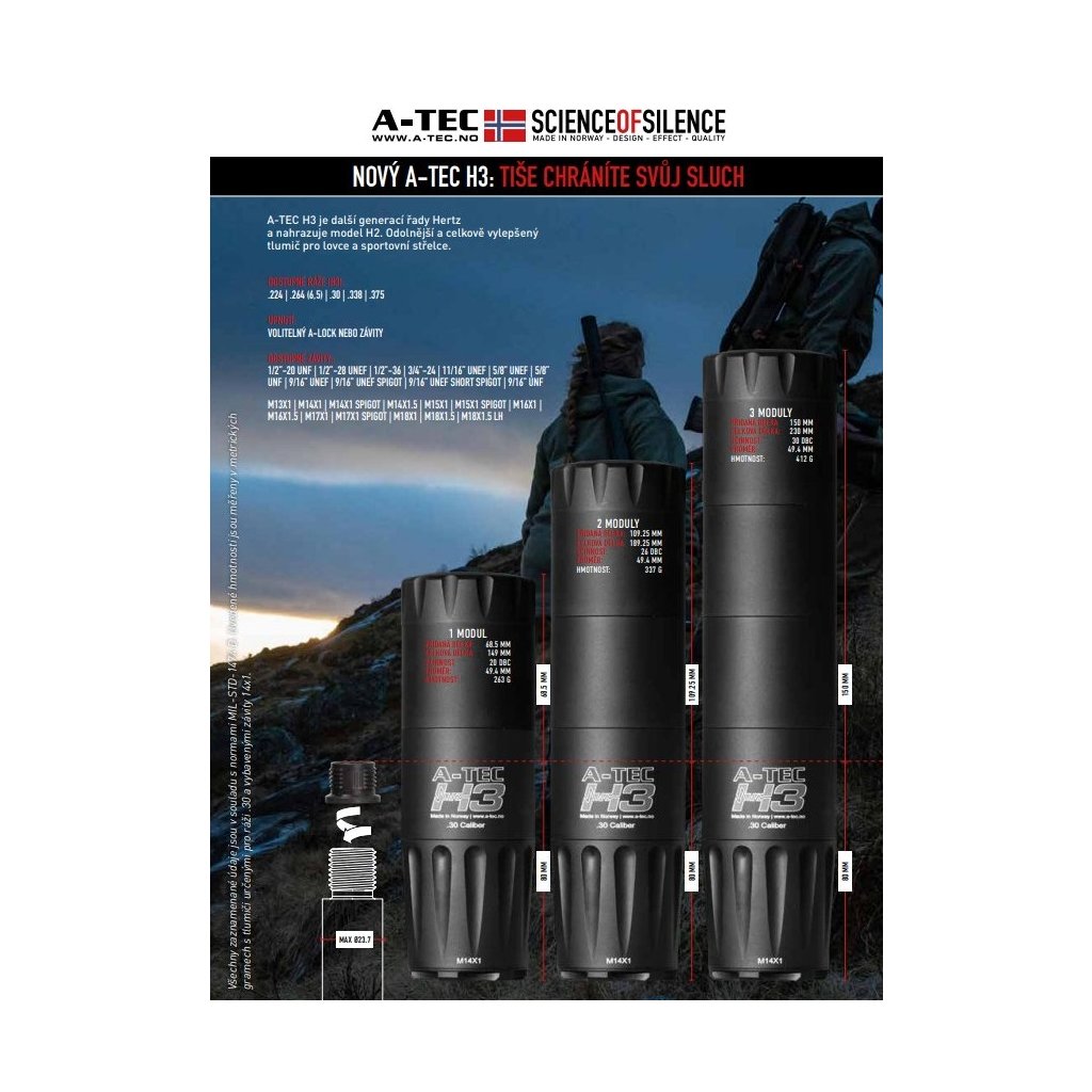 A-TEC H3 nahrazuje doposud nejžádanější a nejprodávanější model H2. Přináší vyšší účinnost (zejména u prvního výstřelu), odolnější konstrukci s ohledem na méně pečlivou údržbu, modernější design a nižší hmotnost. Model H3 je modulový tlumič určen pro opakovací i samonabíjecí lovecké a sportovní zbraně bez předních mířidel. Reflexní tělo jde cca 8 ,cm zpět přes hlaveň a s třemi moduly přidává ~15 ,cm k celkové délce zbraně.
